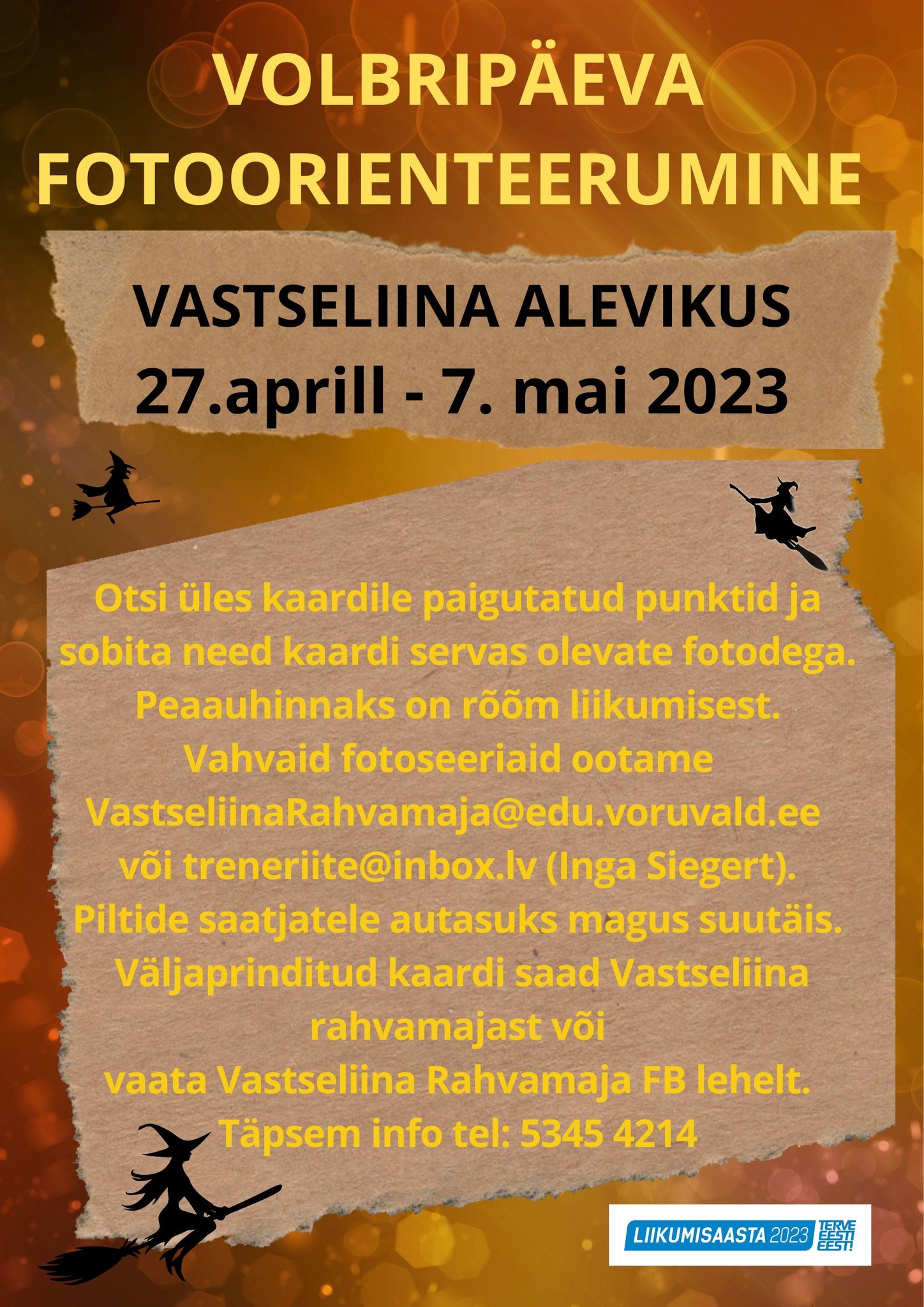 Volbripäeva fotoorienteerumine 27. aprillist 7. maini 2023 VOLBRIPÄEVA FOTOORIENTEERUMINE VASTSELIINA ALEVIKUS.Selle aasta märksõnad on LUUD JA PUUD.Rõõmu liikumisest! Vajuta